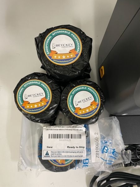 - Includes: Printer, AC power supply, power cord, ribbon take-up cores, ribbon core adapters, 10 unopened label rolls (1" x 0.5")